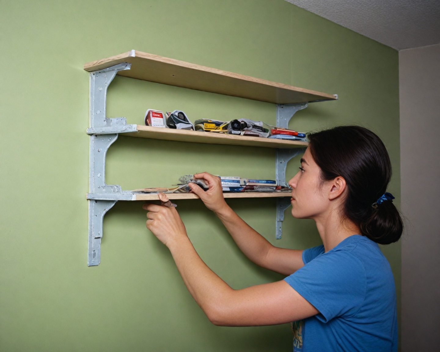 Coloque a prateleira: Após fixar os suportes, coloque a prateleira sobre eles, ajustando para que fique nivelada e firme.